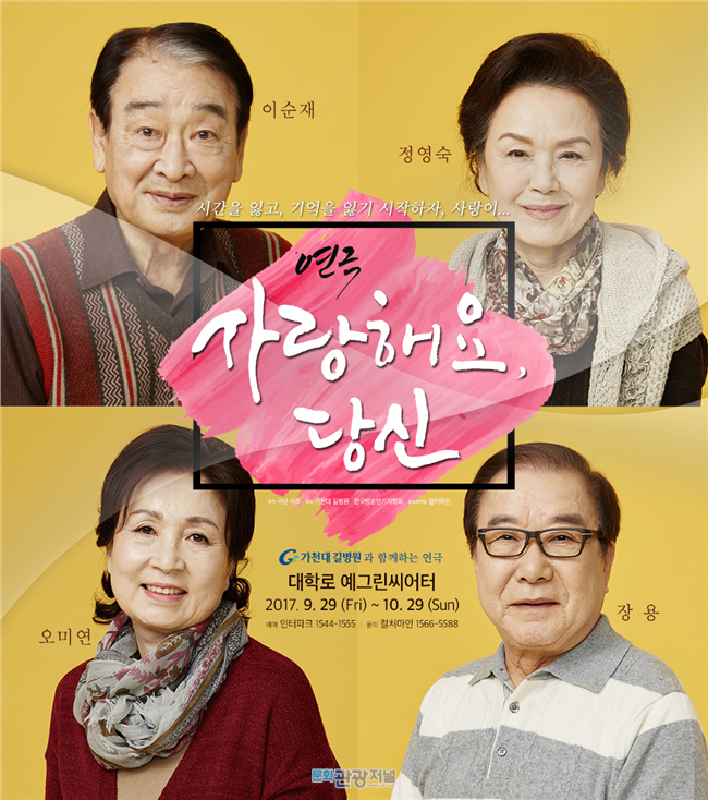 가천대 길병ì›ê³¼ 한êµë°©ì†¡ì—°ê¸°ìží˜‘회가 후ì›í•˜ë©° 극단 사조(æ€æ½®)ê°€ ì œìž‘í•œ ì—°ê·¹ <사랑해요 ë‹¹ì‹ >ì´ ì˜¤ëŠ” 9ì›” 29ì¼ë¶€í„° 대학로 예그린씨어터ì—서 앙코르 ê³µì—°ì„ íŽ¼ì¹œë‹¤. 지난 4ì›” ì´ˆì—°ì„ ì˜¬ë ¸ë˜ <사랑해요 ë‹¹ì‹ >ì€ ì—°ì¼ ë§¤ì§„ í–‰ë ¬ì„ ë³´ì´ë©° 중장년층 ê´€ê°ì„ 중심으로 ë§Žì€ ì‚¬ëž‘ì„ ë°›ì•˜ë‹¤.
