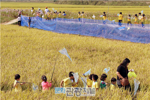 메뚜기는 친환경 ê³¤ì¶©ì˜ ëŒ€ëª…ì‚¬ì´ë‹¤. 메뚜기가 많다는 ê²ƒì€ ë†ì•½ì„ 사용하지 않는다는 ì˜ë¯¸ë‹¤. ì¶•ì œìž¥ì—는 메뚜기만 ë§Žì€ ê²ƒì´ ì•„ë‹ˆë‹¤. ë…¼ì—는 미꾸ë¼ì§€ë„ 많다. 깨ë—한 ê³³ì—서만 나는 ë‹¤ìŠ¬ê¸°ë„ ë³¼ 수 있다. 곡ì‹ì´ ìµì–´ê°€ëŠ” 황금 들íŒì„ 뛰놀며 메뚜기, 미꾸ë¼ì§€ë„ ìž¡ê³ ë‹¤ìŠ¬ê¸°ë„ ì±„ì·¨í•˜ëŠ” 등 ë˜ì‚´ì•„난 ì²ì • 친환경 ë†ì´Œì„ ë§Œë½í• 수 있다.