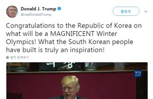 지난 7일(현지시간) 도널드 트럼프 미국 대통령이 한국의 평창 동계올림픽이 성공적으로 개최되길 기원하는 트위터(SNS)를 게시했다.