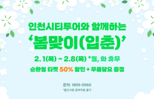 2월에는 봄맞이(입춘) 할인 이벤트, 설날연휴 온가족이 함께하는 가족패키지(티켓 1장으로 온가족 탑승), 발렌타인데이 1+1 이벤트, 인천시티투어 입소문 이벤트 등...
