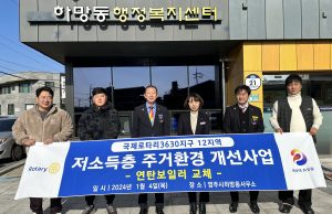 국제로타리3630지구 12지역 영주로타리클럽(회장 강용수)에서는 4일 하망동행정복지센터를 방문해 저소득층 주거환경 개선사업을 위한 성금 100만 원을 기탁했다.