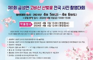 - 금성면 고비산 산벚꽃 행사장 내 촬영 작품 응모, 오는 4월 5~6일, 이틀간 진행