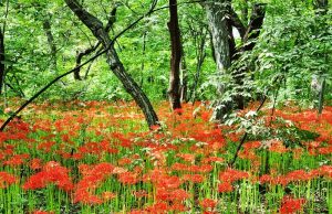 천년의 숲 함양 상림공원에 가을을 알리는 붉은 꽃무릇이 한창 피고 있다.