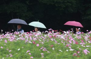 절기상 하지(夏至)인 21일 비가 내리는 가운데 경남 함양군 상림공원에서 때 이른 코스모스가 활짝 펴 관광객들의 눈길을 끌고 있다.