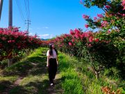 1일 보성군 보성강변 일대 붉게 물든 배롱나무 꽃길을 주민이 거닐고 있다.