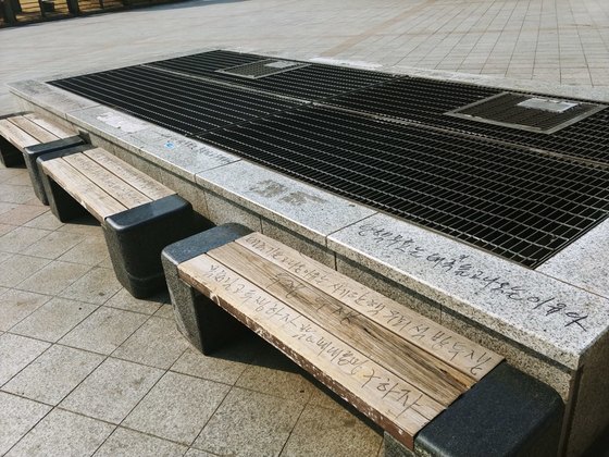 환풍구를 둘러싸고 있는 벤치 8개에도 빠짐없이 빽빽하게 ‘탄핵 무효는 태극기 들고 나오는 이유다’, ‘목숨 걸고 투쟁하라’, ‘박근혜 대통령 구하자’ 등의 낙서가 돼 있었다.