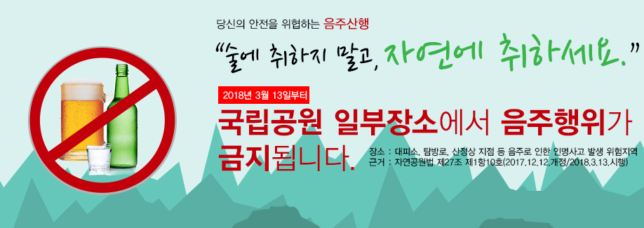 본격적으로 산행을 즐기는 사람이 많아지는 봄이 왔다. 진달래 축제, 벚꽃 축제, 철쭉 축제 등 가지마다 피어난 꽃을 즐기러 온 사람들로 산이 북적거린다. 색색의 등산복을 입고 삼삼오오 모여 정상 인근에 앉아서 한바탕 소풍이 이뤄진다. 문제는 가방에서 나오는 술병이다. 일명 정상주(酒). 친구들과 산행을 즐기는 윤한수(59)씨는 “정상에서 술 한 잔 먹는 즐거움에 산행을 하는 것이 아니겠느냐”고 말했지만, 올해 3월 13일부터는 윤 씨의 즐거움이 무리한 일이 됐다. 국립공원에서 술을 마시는 것이 금지됐기 때문이다.