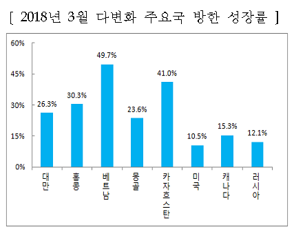 시장별로 살펴보면, 중국은 전년 동기 대비 11.8% 증가한 40.3만 명이 방한했다. 지난해 3월 중순 사드 이슈로 중국인 관광객이 감소한 이후, 1년 만에 증가세로 전환됐고 월 기준으로도 가장 많은 중국인이 입국했다. 이는 중국단체관광이 허용된 지역이 한정적인 상황에서도, 많은 개별관광객이 방한한 데 기인한 것으로 해석된다.
