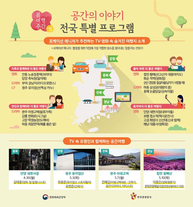 이 중 봄에 더욱 정취를 더하는 4개 촬영지를 건축가, 영화 평론가 등 유명인과 함께 여행하는 ‘공간여행’ 프로그램도 준비돼 있다. 공간여행에 참여하는 여행객들은 영화, 드라마, 광고(CF) 등 촬영지에 대한 숨은 이야기와 촬영 당시의 일화도 듣고, 전문 사진가가 찍어주는 연출사진도 받을 수 있다.