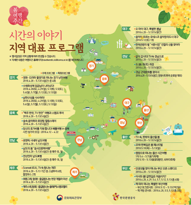특화 프로그램으로는 ▲(부산) ‘어서와 봄! 갈맷길은 처음이지?’ ▲(대구) ‘음악이 흐르는 유네스코 음악창의도시 대구’ ▲(울산) ‘2018 한복 입은 봄 페스티벌’ ▲(경기) ‘수원화성에 임금님이 나타났다!’ ▲(충북) ‘숲 속 음악회와 휴양림 힐링스테이’ ▲(전남) ‘남도의 봄, 음식인문학여행’ ▲(경남) ‘도(島) 화(花) 취경’ ▲(제주) ‘휘둥그레, 탐나는 현장 게릴라 미션’ 등 16개 프로그램이 준비돼 있다.