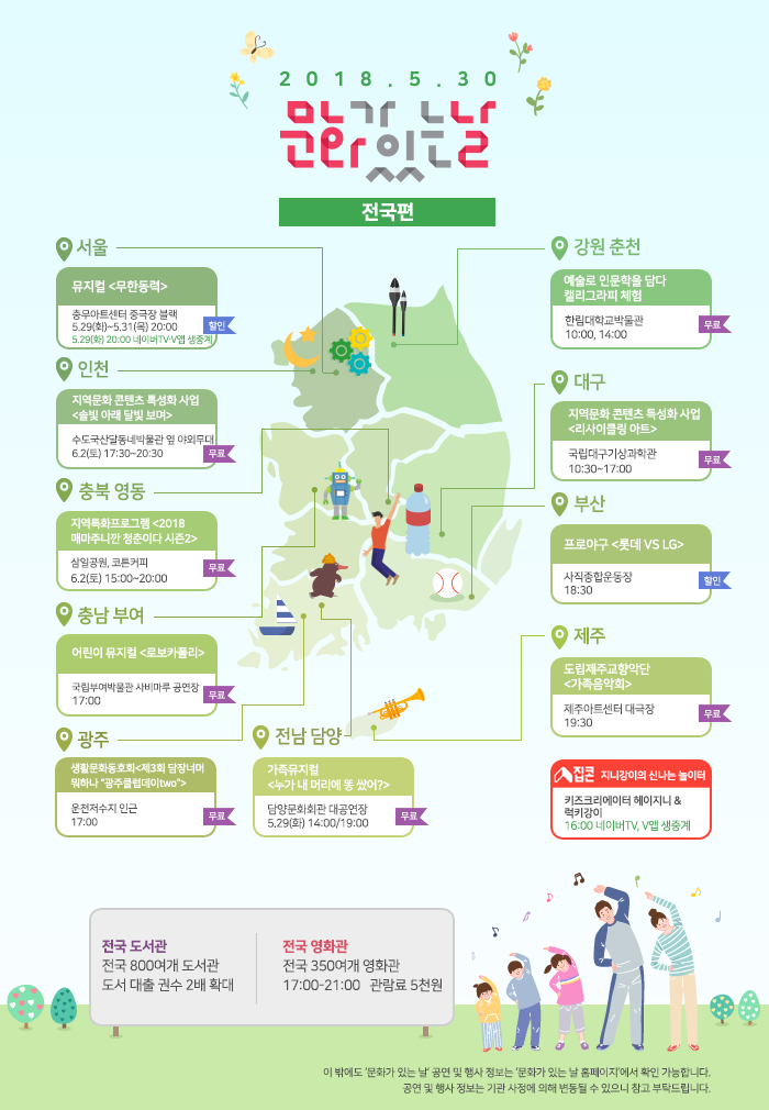 2018년 5월 ‘문화가 있는 날’(5월 30일)과 해당 주간에 전국에서 총 2,365개(5월 23일 기준)의 문화행사가 국민들과 만날 계획이다.