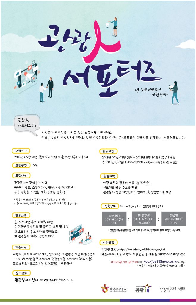 한국관광공사가 관광분야 일자리 콘텐츠를 개발, 홍보하는 ‘제1기 관광인 서포터즈를 모집한다.