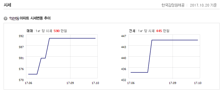 상가의 임대료와 더불어 익선동 주택 가격도 상승하고 있다. 2017년 기준 익선동 아파트 시세 변동 추이를 보면 가파르게 상승하고 있다. 아파트 매매 가격은 평당 시세가 590만 원, 전세 가격의 시세는 평당 445만 원이다.