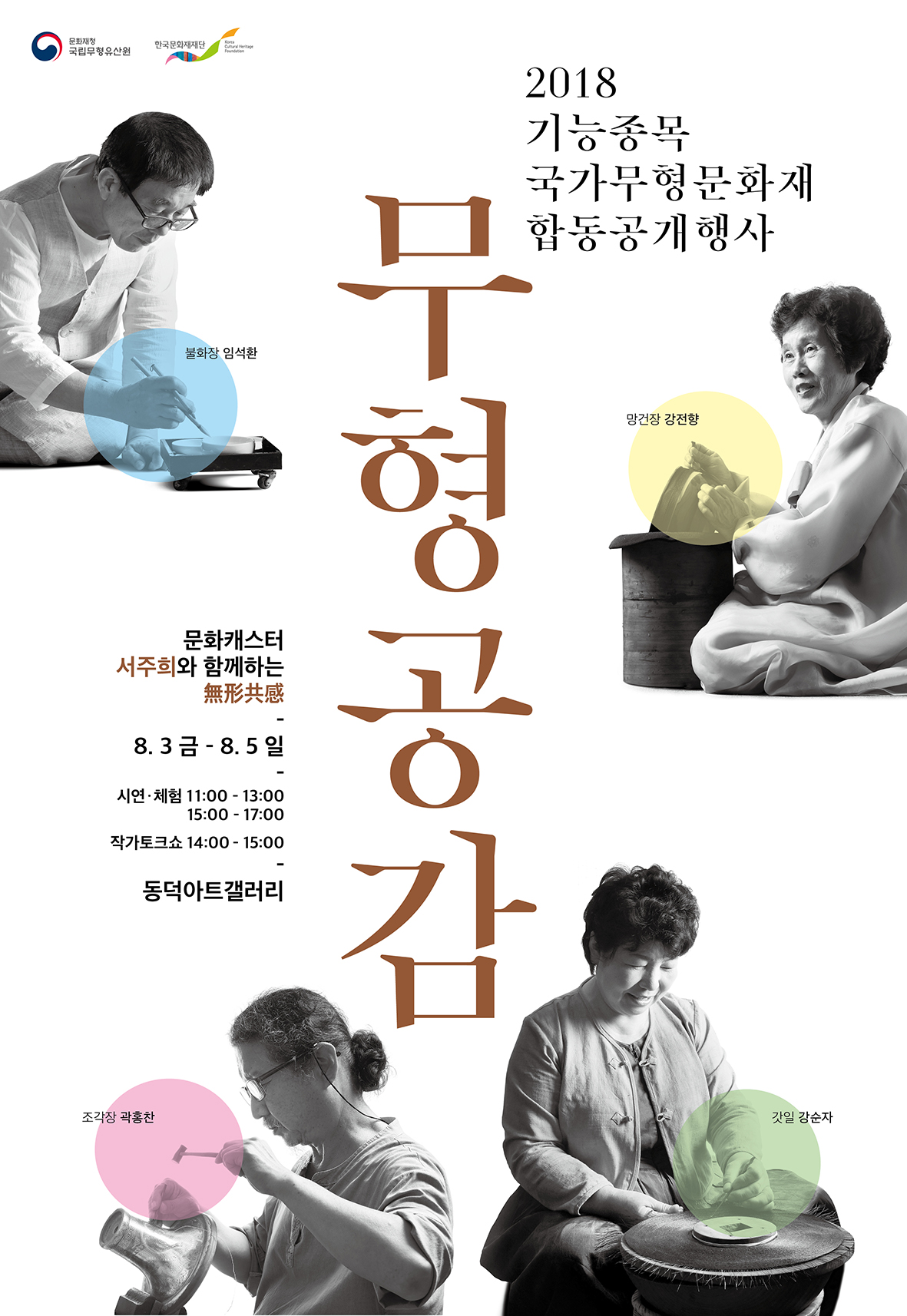 문화재청 국립무형유산원과 한국문화재재단이 지원하는 2018 기능 종목 국가무형문화재 합동공개행사 ‘무형공감 無形共感’이 오는 8월 3일부터 5일까지 동덕아트갤러리에서 개최된다.