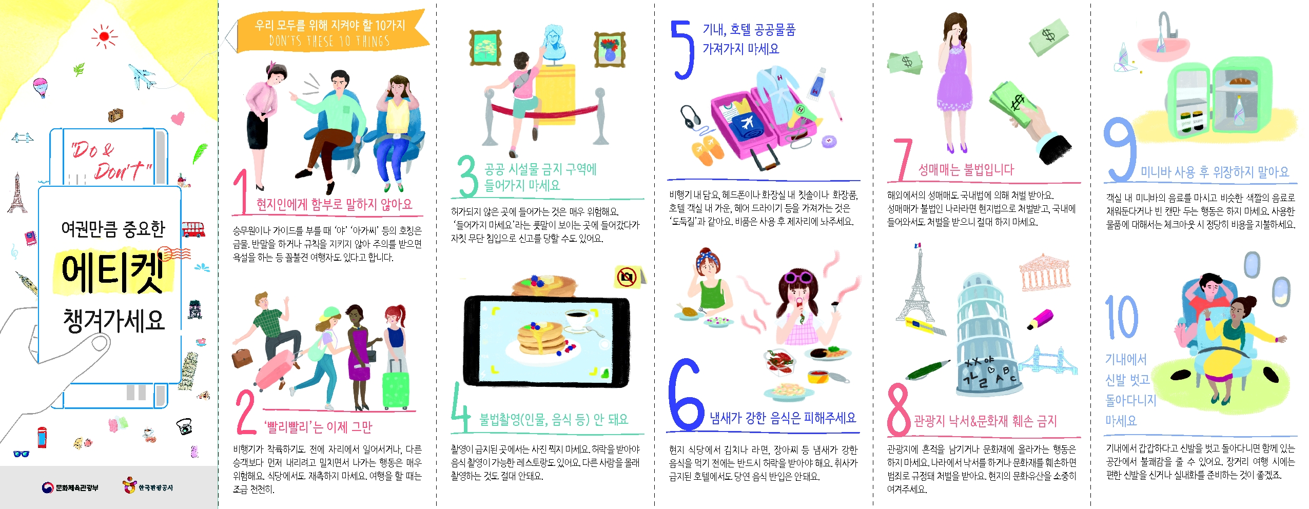 캠페인의 슬로건은 ‘여권만큼 중요한 에티켓 챙겨가세요’이며, 공사는 해외여행을 떠나는 국민들을 대상으로 ‘우리 모두를 위해 지켜야 할 10가지, 실천하면 모두가 행복한 10가지’라는 리플렛과 기념품을 제공한다. 리플렛에는 지난 6~7월 공사가 한국관광학회와 함께 실시한 ‘해외여행객 문화인식 개선 방안 연구’에서 도출된 ‘지켜야 할 에티켓 및 실천해야 할 에티켓’ 각 10가지와 함께, 해외 안전여행 정보도우미인 ‘저스트 터치 잇(Just Touch It)’ 정보가 수록돼 있다.