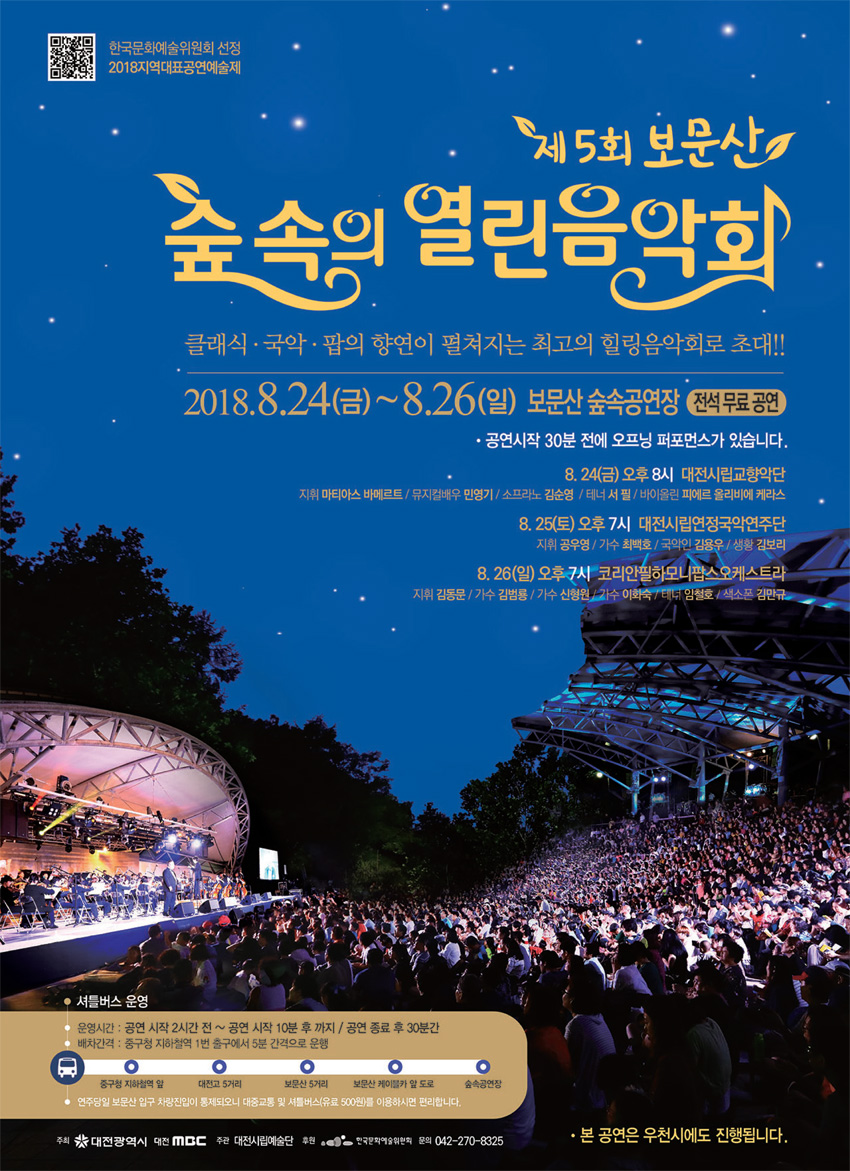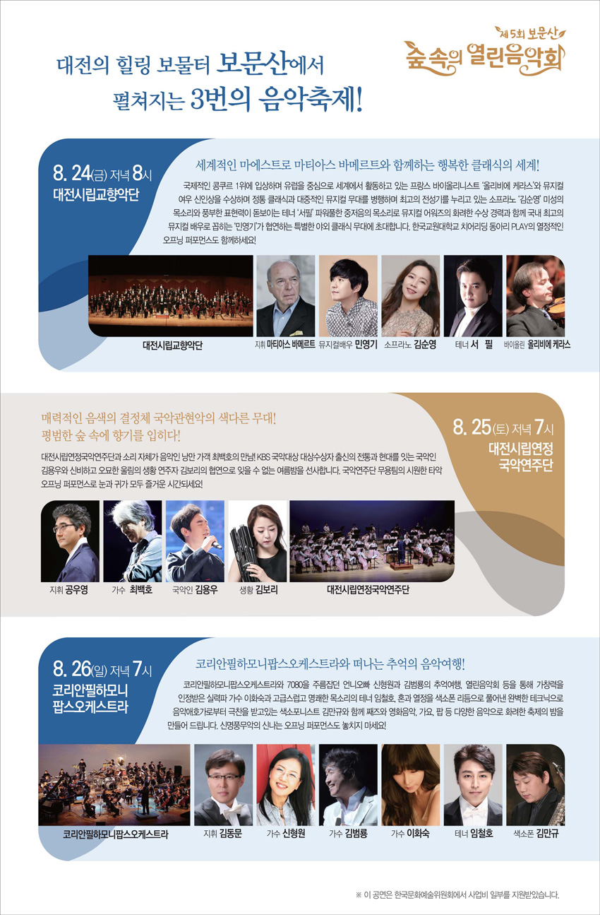 ‘숲속의 열린음악회’는 2017년도에 이어 2년 연속 한국문화예술위원회 지역대표공연예술제 지원 사업으로 선정돼 한 단계 도약하는 토대도 마련됐다. 올해로 5회째를 맞는 ‘숲속의 열린음악회’는 대전시와 대전MBC가 공동주최하고 대전시립예술단이 주관하는 행사로 가족과 함께 즐길 수 있는 클래식, 국악, 팝의 향연으로 펼쳐진다.