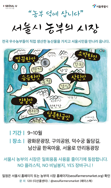 서울시는 9월부터 10월까지 광화문광장, 만리동광장, 덕수궁돌담길, 구의공원, 남산한옥마을 등 도심공원 5개소에서 우수농수특산물과 문화축제가 어우러지는 ‘농부의 시장’을 연다고 밝혔다. 9월 1일(토)이 첫 개장으로, 운영 시간은 오전 10시부터 오후 6시까지이다.