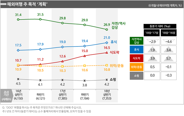 세종대학교 관광산업연구소와 여행전문 리서치 기관 컨슈머인사이트가 공동 수행하는 ‘주례 여행 행태 및 계획 조사’(매주 500명, 연간 26,000여 명 조사)에 따르면, 2018년 상반기 해외여행을 계획하고 있는 사람의 26.9%가 자연·역사 감상을 주 여행목적으로 꼽았다. 그 다음은 휴식 21.0%, 식도락 16.5%로 집계됐다. 휴식과 식도락의 비중을 합치면 자연과 역사 감상보다 보고, 쉬고, 먹는 것이 해외여행의 주목적임을 알 수 있다.