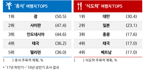 그렇다면 휴식과 식도락을 선호하는 해외여행족이 선호하는 국가는 어딜까? 2017년 하반기부터 2018년 상반기까지 지난 1년간 휴식을 주목적으로 계획한 여행지는 남태평양과 동남아시아에 집중해 있었다. 괌은 휴식이 주목적인 경우가 절반을 차지했고(50.5%), 다음은 사이판 47.4%, 인도네시아 44.6%, 태국 36.2%, 필리핀 36.0% 등의 순이었다. 식도락 여행지는 아시아 지역이 대세였다. 그 중 대만이 30.4%로 가장 높았고, 다음은 일본 23.1%, 홍콩 17.6%, 태국과 베트남(각각 17.0%)의 순이었다.