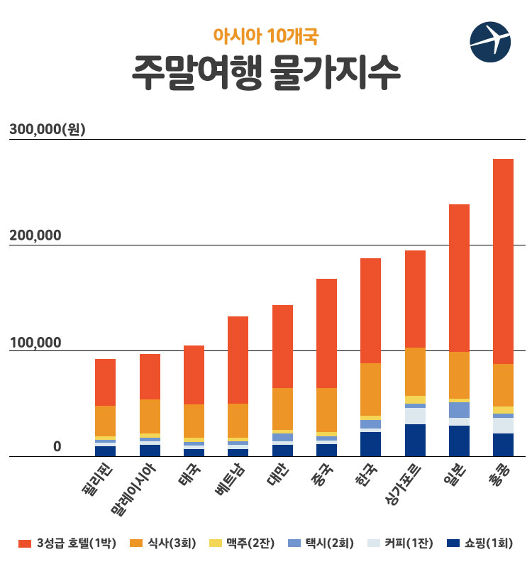 3성급 호텔 1박, 식사 3회, 맥주 2건, 택시 2회, 커피 1잔, 쇼핑 1회의 비용으로 물가지수를 매겼을 때 필리핀~태국은 한화로 10만 원 안팎이었다. 동남아시아에 이어 대만과 중국이 물가지수가 낮았으며 그 다음이 한국이었다. 한국에서는 같은 조건으로 관광했을 시 181,075원이었고 물가지수가 가장 낮은 필리핀과 비교하면 약 2배 비쌌다.