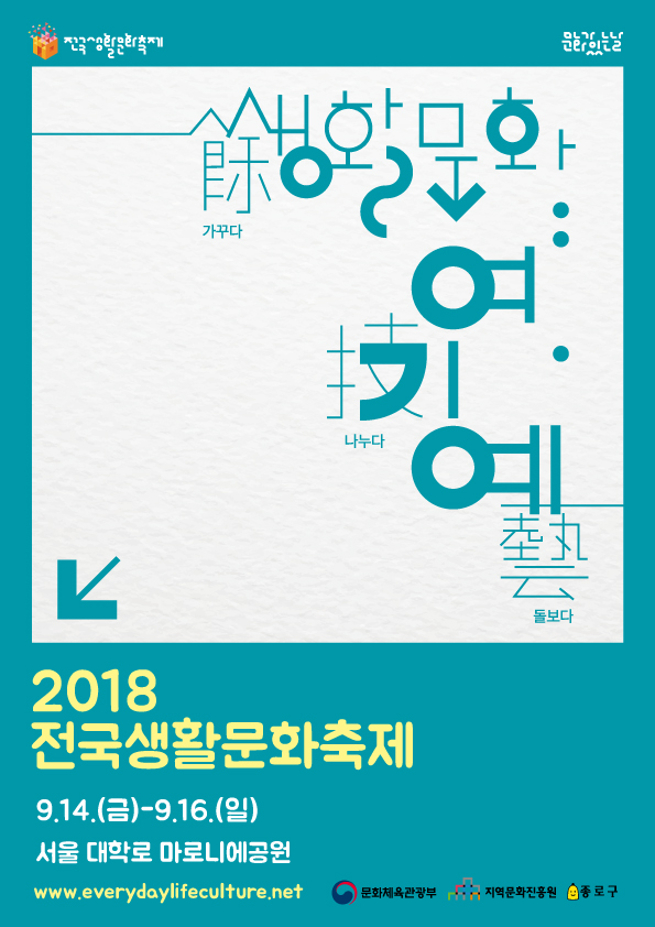 문화체육관광부(장관 도종환, 이하 문체부)가 주최하고 지역문화진흥원(원장 나기주)이 주관하는 ‘2018 전국생활문화축제’가 오는 9월 14일(금)부터 16일(일)까지 서울 대학로 마로니에공원 일대에서 열린다.