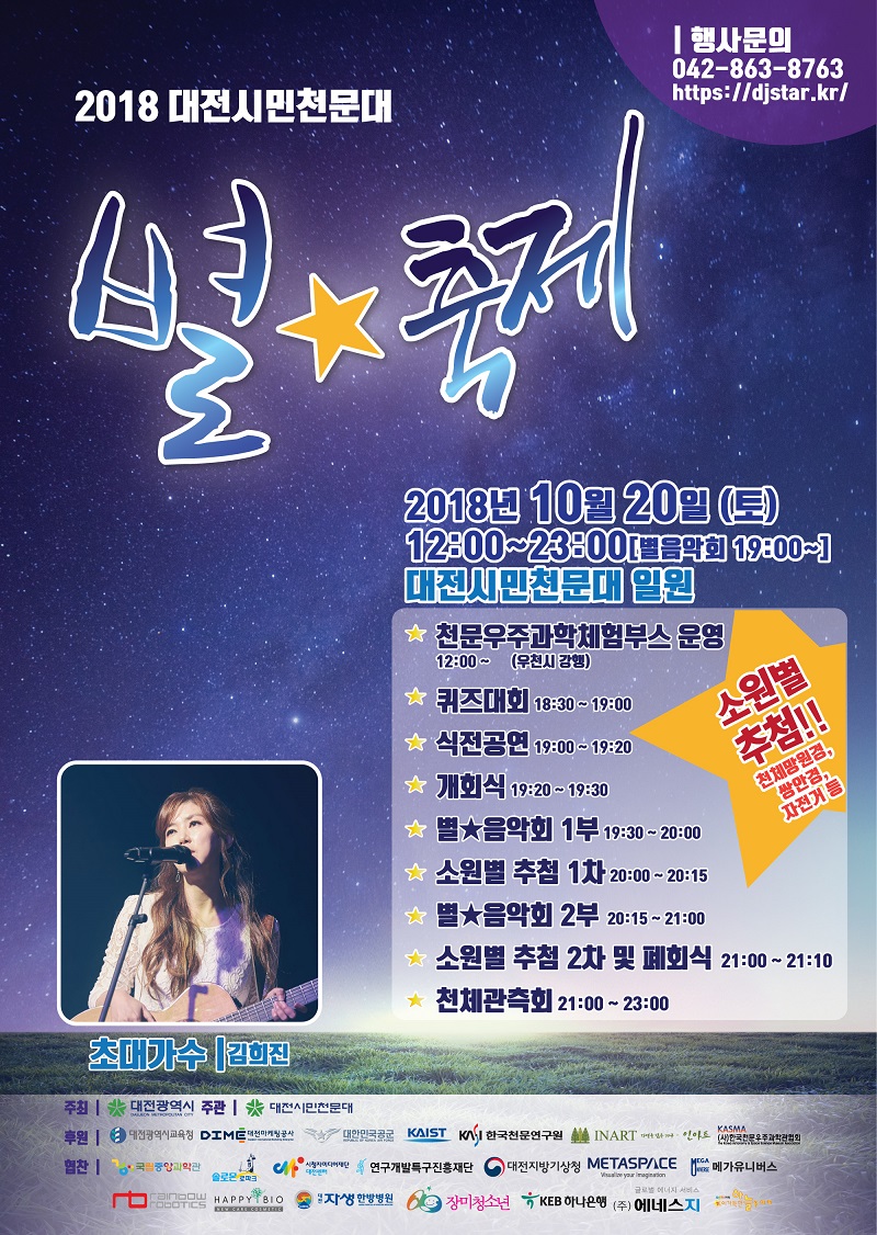 대전시는 오는 10월 20일 낮 12시부터 밤 11시까지 대전시민천문대에서 과학과 음악이 함께하는‘대전시민천문대 별★축제’를 개최한다고 밝혔다.