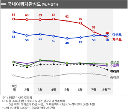 지난 30여 개월 동안 제주도는 강원도를 줄곧 10%포인트 이상의 차이로 앞서며, 국내 여행지 관심도에서 부동의 1위 자리를 지켜 왔다. 그러나 지난 7월 처음으로 그 차이가 3%포인트로 좁혀졌으며, 8월에 실시된 조사에서는 강원도 50%, 제주도 48%로 역전 당한 상태다.
