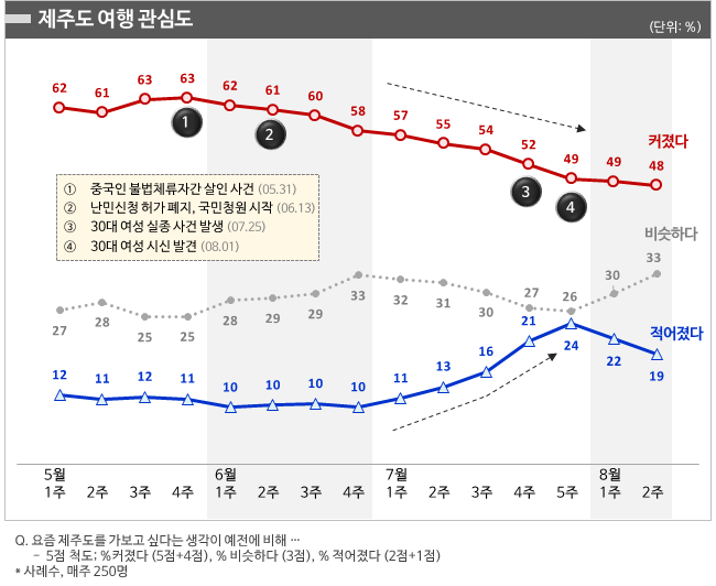 조금 더 구체적으로 알아보기 위해 지난 5월부터 8월까지 제주도 여행 성수기의 주 단위 조사결과를 살펴봤다. 역시 6월부터 11주 연속 하락세를 이어가고 있었다. 5월말 63%로 시작한 제주도 여행 관심도는 매주 1~2%포인트씩 하락해 7월 다섯째 주에는 처음으로 40%대로 진입했고, 8월 둘째 주에는 48%로 최저점을 기록했다.