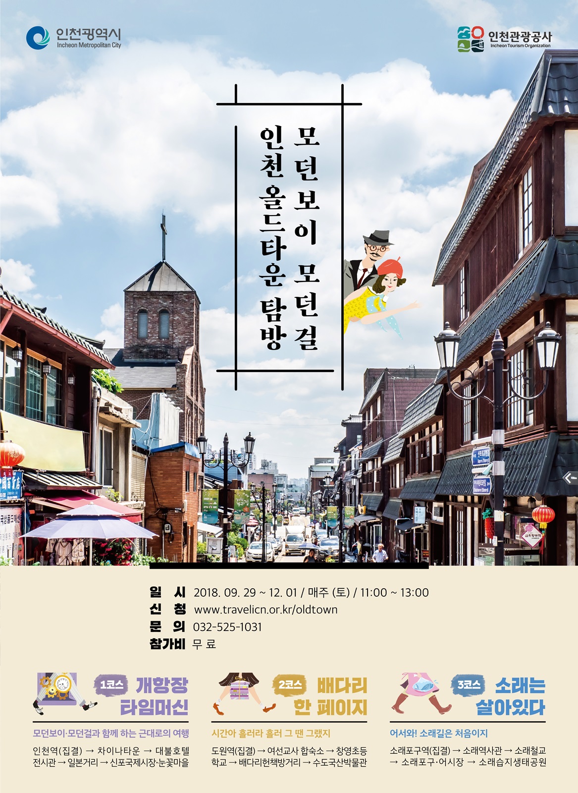 인천광역시와 인천관광공사는 인천 원도심 관광활성화의 본격적인 시작으로 인천 원도심 3개 테마코스를 함께 걷는 <모던보이 모던걸 인천올드타운 탐방>을 9월 29일부터 12월 1일까지 매주 토요일 총 15회 실시한다고 밝혔다.