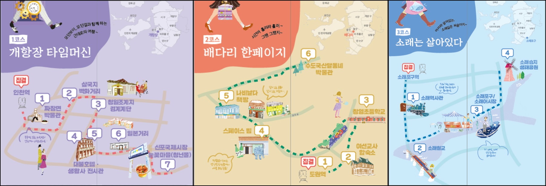 정기탐방 테마코스로는 ▲[1코스] 개항장 타임머신 코스(인천역 집결-차이나타운-대불호텔 -일본거리-신포국제시장·눈꽃마을) ▲[2코스] 배다리 한 페이지 코스(도원역 집결-여선교사합숙소-창영초등학교-스페이스빔-배다리헌책방거리-수도국산달동네박물관) ▲[3코스] 소래는 살아있다 코스(소래포구역 집결-소래역사관-소래철교-소래포구·어시장-소래습지생태공원)로 구성돼 있으며, 매주 한 코스씩 3개의 코스를 순차적으로 운영한다. 참가 인원은 회당 최대 40여 명으로 진행된다.