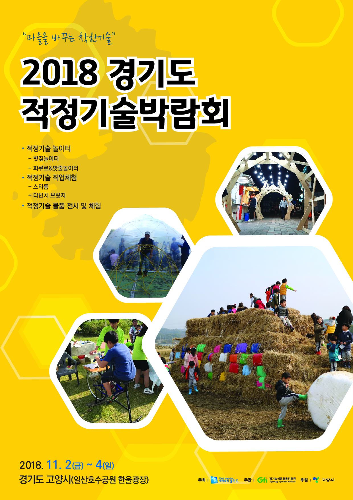 경기도는 ‘2018년 경기도 적정기술박람회’를 11월 2일부터 4일까지 사흘간 경기도 고양시 호수공원 한울광장 일원에서 개최한다고 밝혔다.
