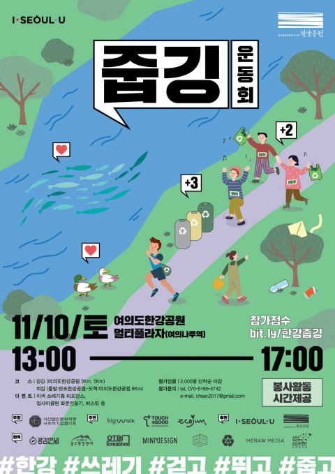5깅 운동의 처음은 ‘줍깅’이다. 걷고 달리며 눈에 띄는 쓰레기를 줍는 ‘플로깅’ 운동회가 11월 10일 오후 1시부터 5시까지 여의도한강공원 및 반포한강공원 일대에서 펼쳐진다. 플로깅(plogging)은 ‘줍다(pick up)’와 ‘조깅(jogging)’의 합성어로, 조깅하며 쓰레기를 줍는 행위를 말한다. 2016년 스웨덴에서 시작된 이래 운동하며 환경을 보전하는 일석이조의 효과로 주목받고 있다.
