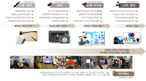 총 2천6백만 관객을 동원한 영화 <신과 함께> 시리즈의 성공 배경에는 바람에 흩날리는 털을 실감나게 표현하는 특수효과(VFX) 기술이 있었고, 대금, 아쟁, 가야금 등 23종 악기의 소리를 추출해 개발된 가상 국악악기음원 저장소(라이브러리)는 ‘방탄소년단’의 <아이돌(IDOL)>에서 한국의 선율을 구현했다. 전국 330개 초등학교에서는 ‘가상현실(VR) 스포츠실’을 설치해 대형 체육관이 없더라도 학생들이 축구, 양궁, 야구 등 스포츠를 즐기고, 국립어린이청소년도서관 등에 설치된 가상현실 동화구연실에서는 어린이들이 화면에 투영된 자신의 영상과 함께 동화를 실감나게 체험하고 있다.