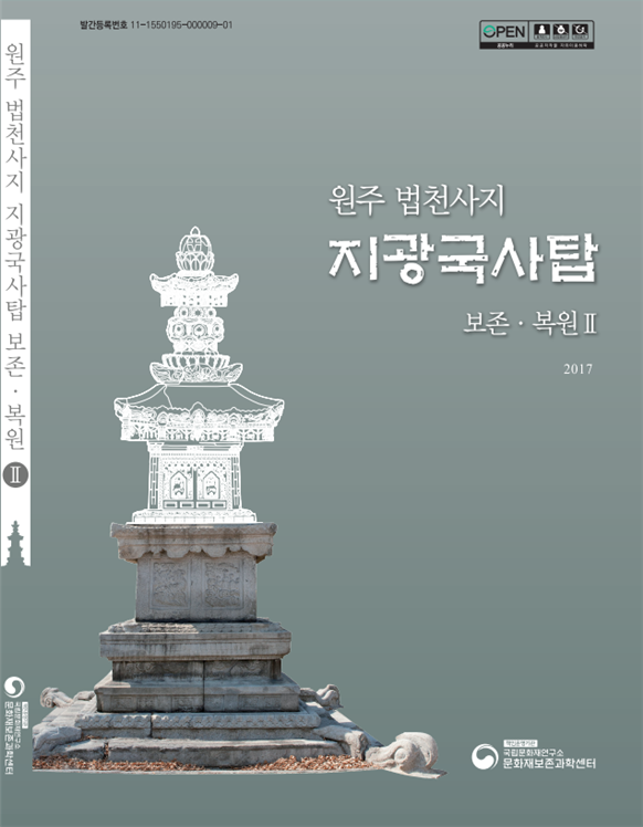 보고서 「원주 법천사지 지광국사탑 보존‧복원Ⅱ」는 2017년 사업내용을 정리한 것으로 보존처리, 조사연구, 학술연구 성과 등을 수록했다. 1957년 수리에 사용된 시멘트에 의한 손상 원인과 구조적인 문제점을 해석했다. 시멘트 제거 이후 모습도 확인할 수 있다. 또한, 3차원 입체스캔과 3D 프린팅을 활용한 모형제작 등 3D 콘텐츠로 구축한 자료도 담았다.