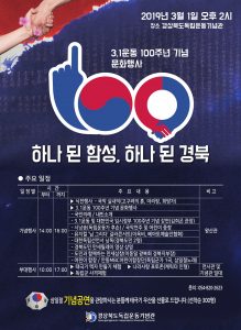 경상북도독립운동기념관(관장 김희곤)은 3·1운동 및 대한민국임시정부 수립 100주년을 맞은 올해 도민들과 함께하는 다양한 사업을 추진한다. 그 첫걸음으로 오는 3.1절에는 ‘하나 된 함성, 하나 된 경북’이라는 이름 아래 다채로운 문화행사가 열린다.
