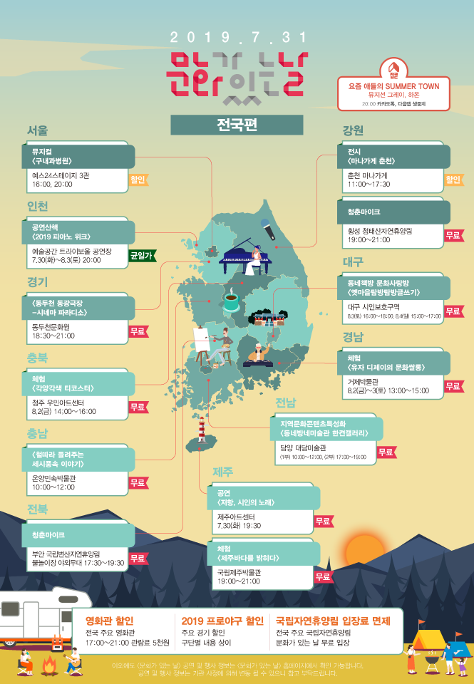 매달 마지막 수요일은 국민들이 일상에서 문화를 더욱 쉽게 접할 수 있도록 하기 위해 문화체육관광부(장관 박양우, 이하 문체부)가 지정한 ‘문화가 있는 날’이다. 2019년 7월 ‘문화가 있는 날’(7. 31.)과 해당 주간(7. 29.~8. 4.)에는 전국에서 문화행사 2,429개가 국민들과 만날 예정이다.