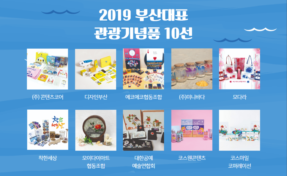 기념품 10선 할인 이벤트에는 ▲콘텐츠코어의 ‛꼬마갈매기 런즈’ ▲디자인부산의 ‛고등어캐릭터 굳즈’ ▲에코에코 협동조합의 ‛부산 이미지 보따리’ ▲(주)미니바다의 ‛부산바다를 담은’ ▲모다라의 ‛부산의 향기를 담은’ ▲착한세상의 ‛부산의 정서를 담은 사투리’ ▲모이다아트 협동조합의 ‛광안리를 담은’ ▲대한공예 예술협동조합의 ‛부산을 수놓다’ ▲코스웬콘텐츠의 ‛부산언니 뷰캉스 키트’ ▲코스마일 코퍼레이션의 ‛씨스라발라라 바다케어세트’의 10개 업체가 참여 한다.