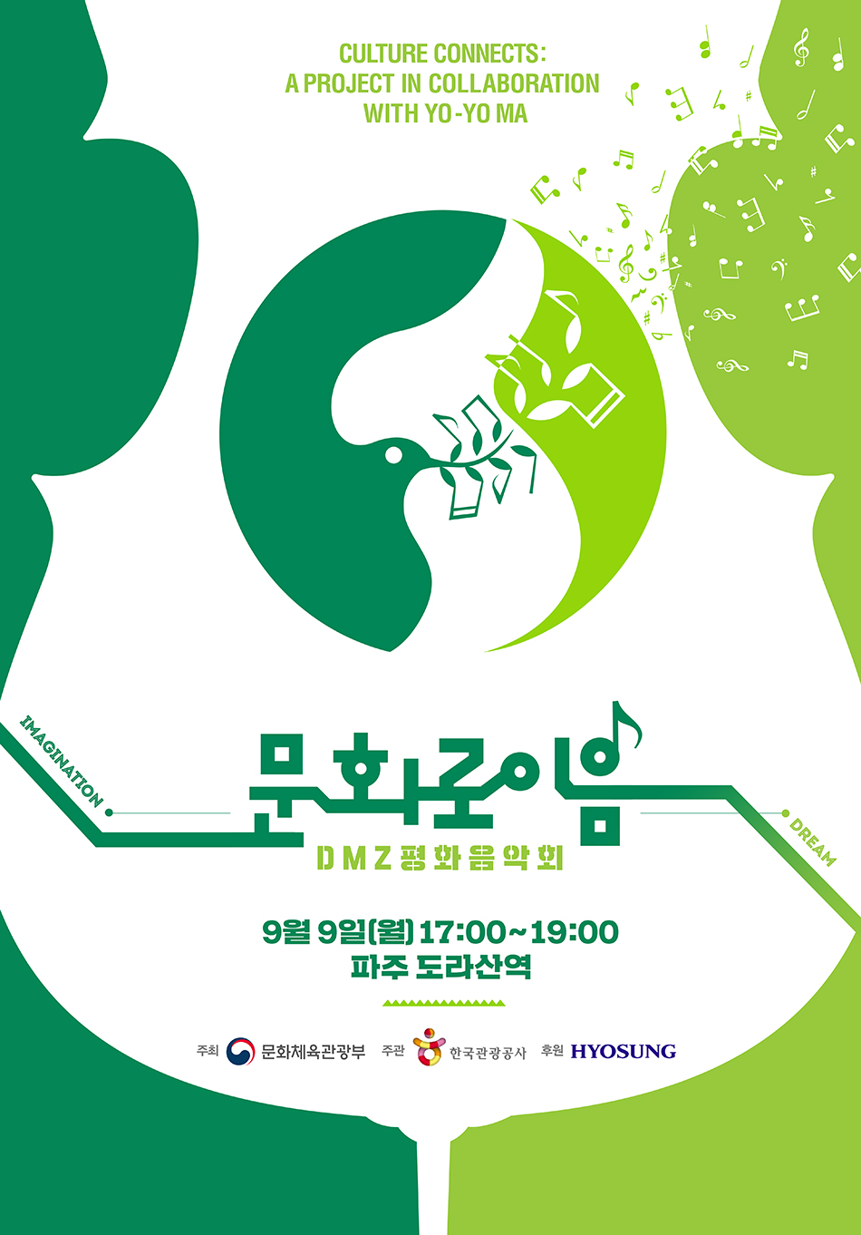 문화체육관광부(이하 문체부)는 오는 9월 9일 파주 도라산역에서 세계적인 첼로 연주가 요요마(Yo-Yo Ma)와 김덕수·안숙선·김철웅·옥상달빛 등, 국내 유명 음악가들이 참여하는 ‘문화로 이음: 디엠지(DMZ) 평화음악회’를 한국관광공사와 함께 개최한다.