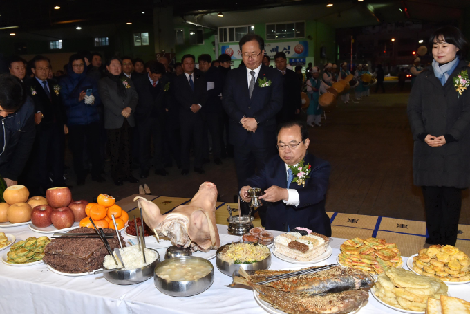 부산시(시장 오거돈)는 오늘(2일) 경자년 새해 첫 경매를 기념해 부산공동어시장(대표이사 박극제)에서 출어선 안전과 만선을 기원하는 초매식을 개최했다.