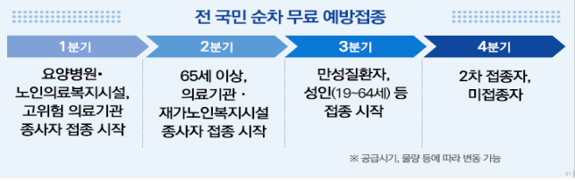 2분기에는 65세 이상 국민들과 노인재가복지시설, 장애인 거주·이용시설 등 취약시설 입소자와 종사자에게 예방접종을 시행한다.