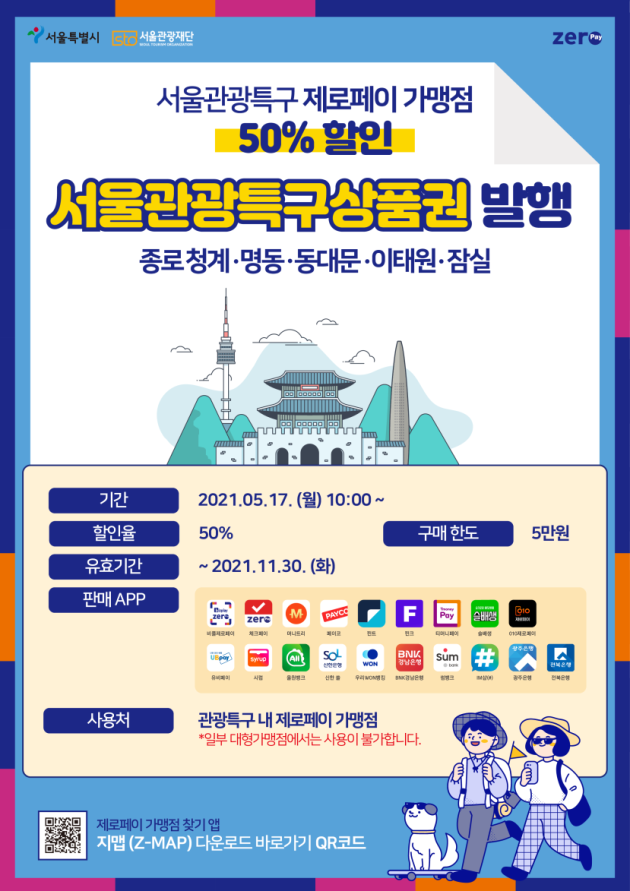 5월 17일(월) 오전 10시부터 50% 할인된 가격으로 판매 예정인 서울관광특구상품권은 종로 청계‧명동‧동대문‧이태원‧잠실 등 5개 관광특구 내 제로페이 가맹점에서 사용할 수 있다.