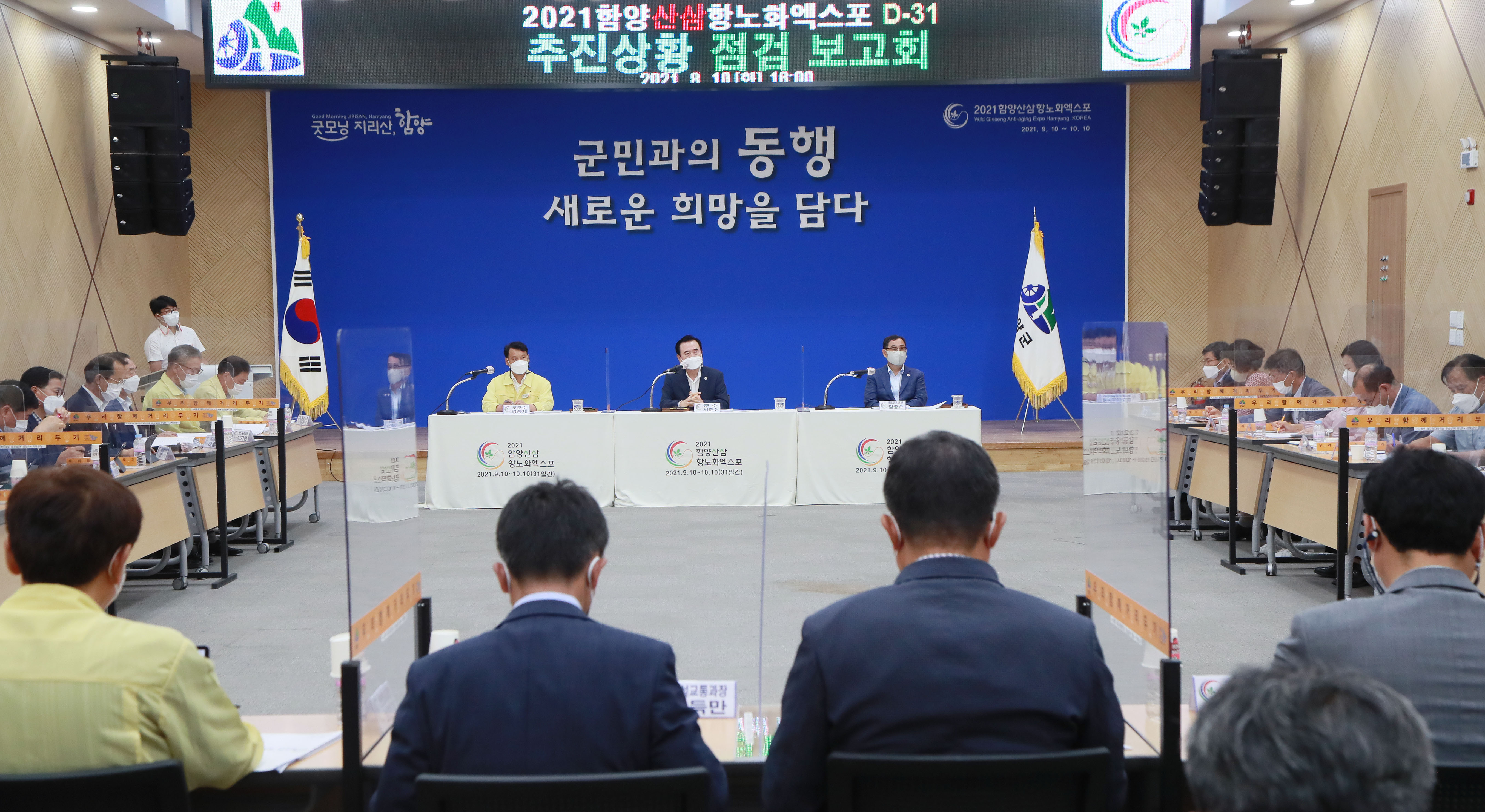 서춘수 군수는 “그동안 함양산삼항노화엑스포의 성공적 개최를 위해 많은 노력을 기울인 모든 분들께 감사의 뜻을 전한다. 엑스포 개최까지 얼마 남지 않은 만큼 기반시설 등의 세심한 점검과 철저한 방역체계구축으로 엑스포를 성공 개최로 이끌어 산삼과 항노화 산업의 중심 함양으로 도약할 수 있도록 각자의 자리에서 끝까지 최선을 다해달라.”고 말했다.