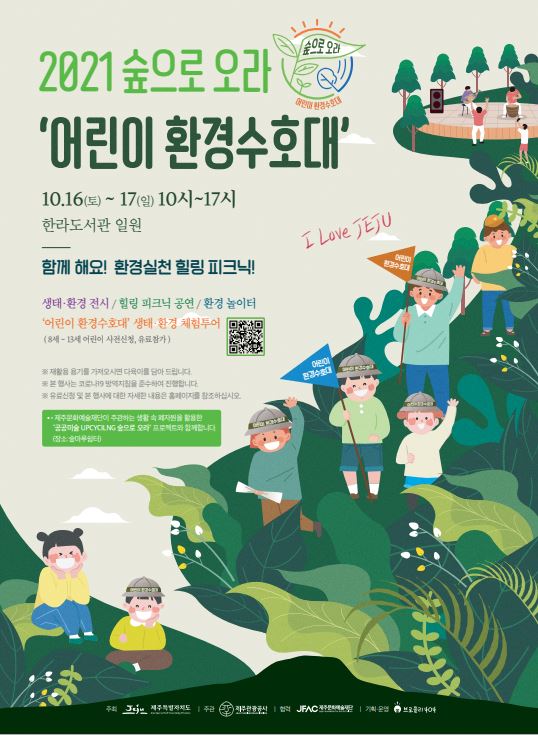 제주특별자치도와 제주관광공사(사장 고은숙)는 오는 10월 16일부터 17일까지‘생태, 환경’을 테마로 코로나블루 극복을 위한 가족 참여형 관광 콘텐츠 「숲으로오라, 어린이 환경수호대」를 개최한다고 13일 밝혔다.