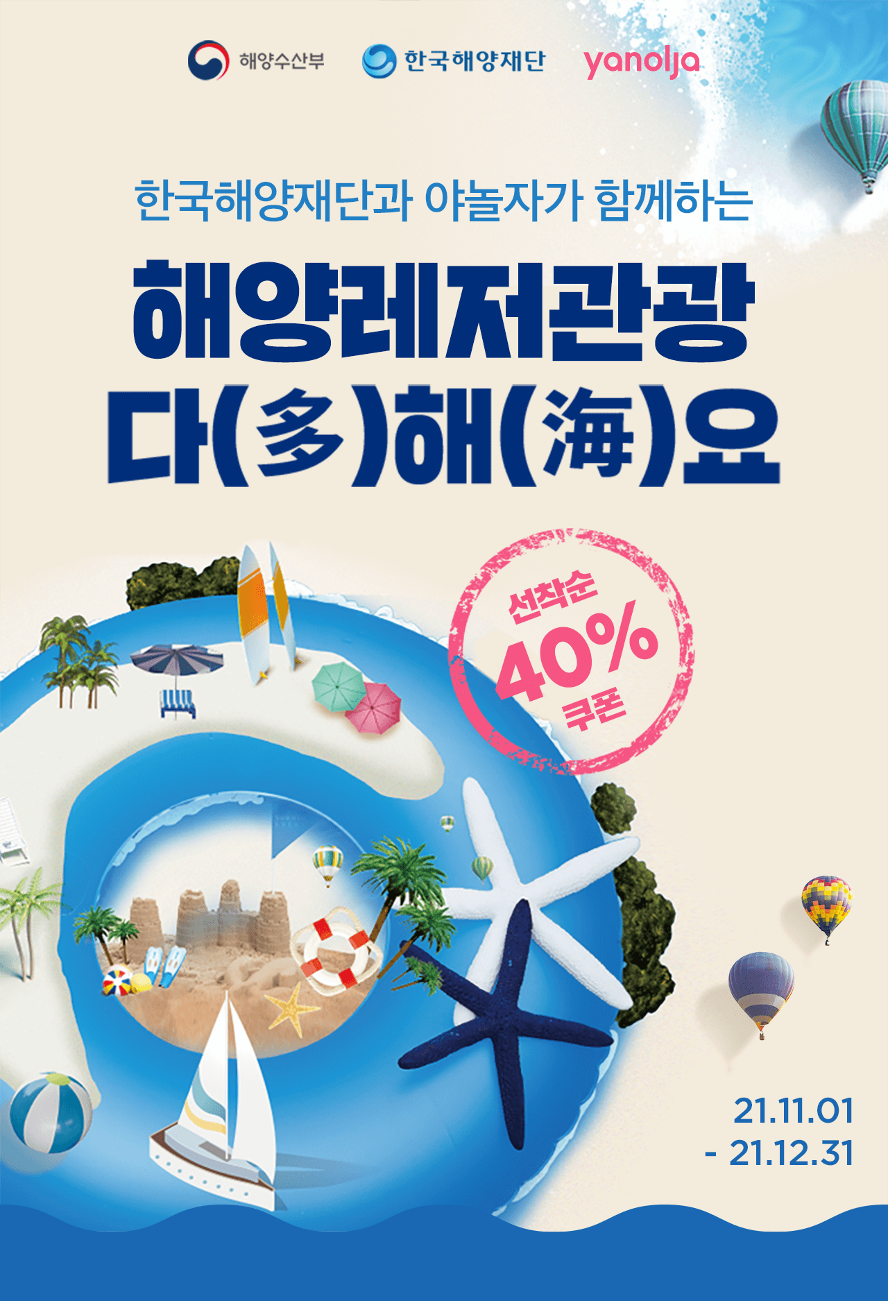 해양수산부와 한국해양재단은 단계적 일상회복을 맞아 11월 8일(월)부터 여가 플랫폼인 ‘야놀자’와 함께 ‘우수 해양관광상품 온라인 판매 기획전’을 개최한다고 8일 밝혔다.