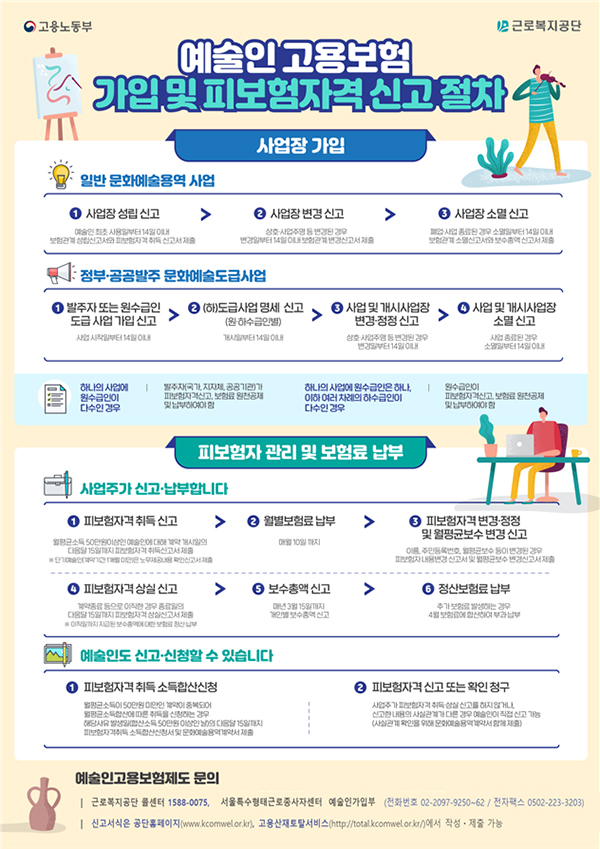 예술인 고용보험에 관한 세부 사항은 근로복지공단 서울특수형태근로종사자센터 예술인가입부(☎1588-0075 또는 02-6945-0650)에서, 문화예술용역 관련 계약 체결 상담 및 지원은 한국예술인복지재단(☎02-3668-0258)에 문의하면 된다.
