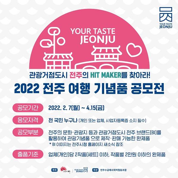 이 공모전은 개인 및 업체, 지역 제한 없이 사업자등록이 된 국민이면 누구나 응모할 수 있다. 관광거점도시 전주의 관광 BI(YOUR TASTE JEONJU) 등을 활용한 전주의 문화 또는 관광지의 특성을 모티브로 관광기념품으로 판매 가능한 완제품이면 된다.