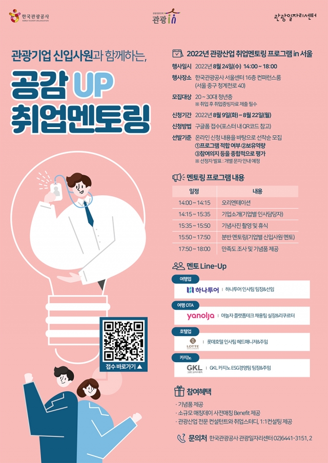 오는 8월 24일 공사 서울센터에서 열리는 이 멘토링 행사는 구직자 맞춤형 취업지원 서비스를 제공하고자 관광일자리센터가 개소한 2018년부터 실시하는 사업이다. 이번 행사엔 관광전문인력포털 ‘관광인’ 회원 353명을 대상으로 취업 선호 기업 설문을 실시해 여행업, OTA, 호텔업, 카지노 등 업종별로 선정된 하나투어, 야놀자, 롯데호텔, 그랜드코리아레저(GKL)가 멘토 기업으로 참여한다. 또한 각 기업별 인사 담당자뿐만 아니라 입사 3년 내외의 신입직원들도 멘토로 참여해 구직자들의 눈높이에 맞추어 보다 풍성하고 생생한 직무 경험과 최신의 취업준비 노하우가 제공될 것으로 기대된다.