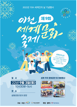 이천시는 이천시가족센터와 오는 9월 3일 설봉공원 토야광장에서 제9회 이천세계문화축제를 개최한다고 30일 밝혔다.