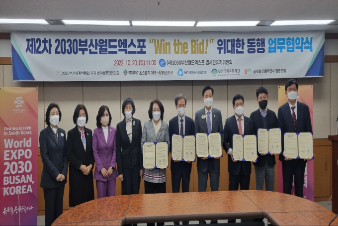 이번 업무협약을 체결한 5개의 기관·단체는 2030부산세계박람회 유치에 이바지하고자 자발적으로 업무협약에 참여했다. 이들 기관·단체는 앞으로 2023년 개최지 발표일까지 2030부산세계박람회 유치 홍보, 범국민적 공감대 형성 등 다양한 협력사업을 추진할 예정이다.