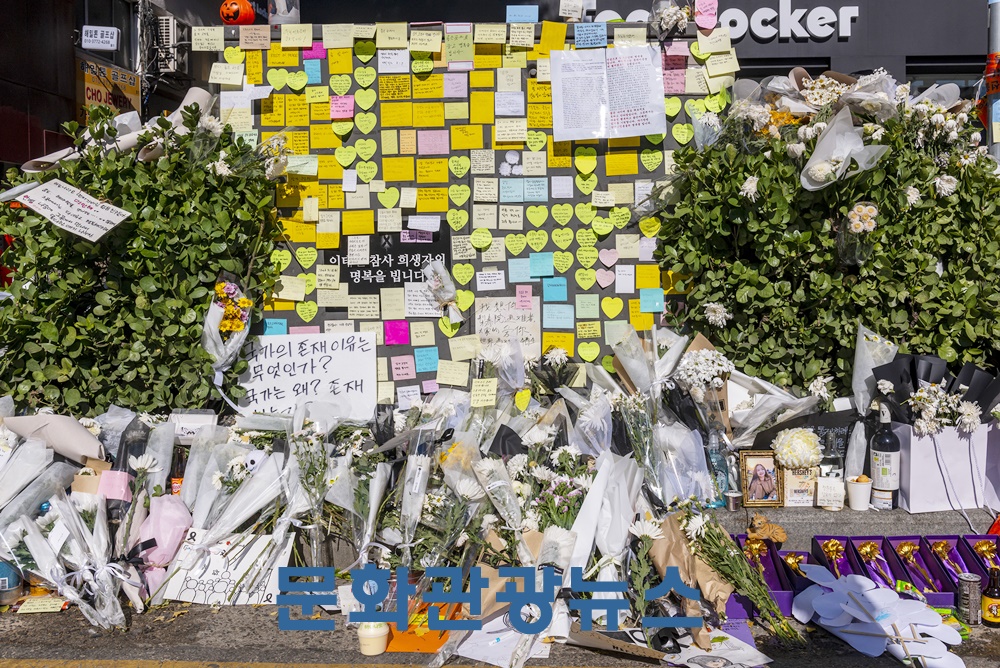 ‘이태원 핼러윈 참사’ 국가 애도 기간 마지막 날인 5일 이태원역 1번 출구는 시민들이 자발적으로 마련한 추모 공간이다. 희생자를 추모하는 메모가 적힌 포스트잇과 국화꽃이 기둥과 벽, 바닥을 메웠다. 핼러윈을 앞둔 지난달 29일 밤 156명의 목숨을 앗아간 믿기 힘든 참극의 현장을 지난 카메라에 담았다.